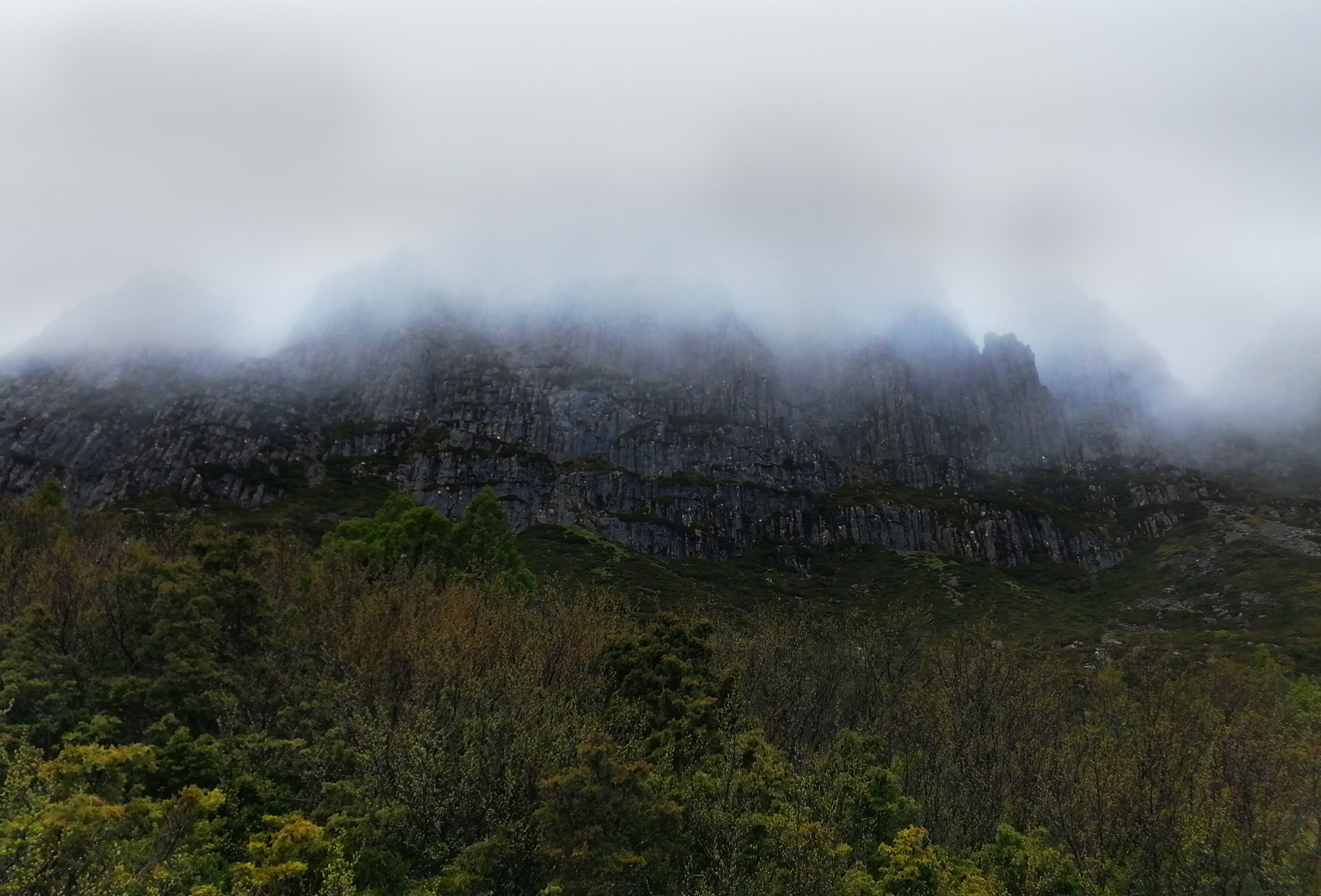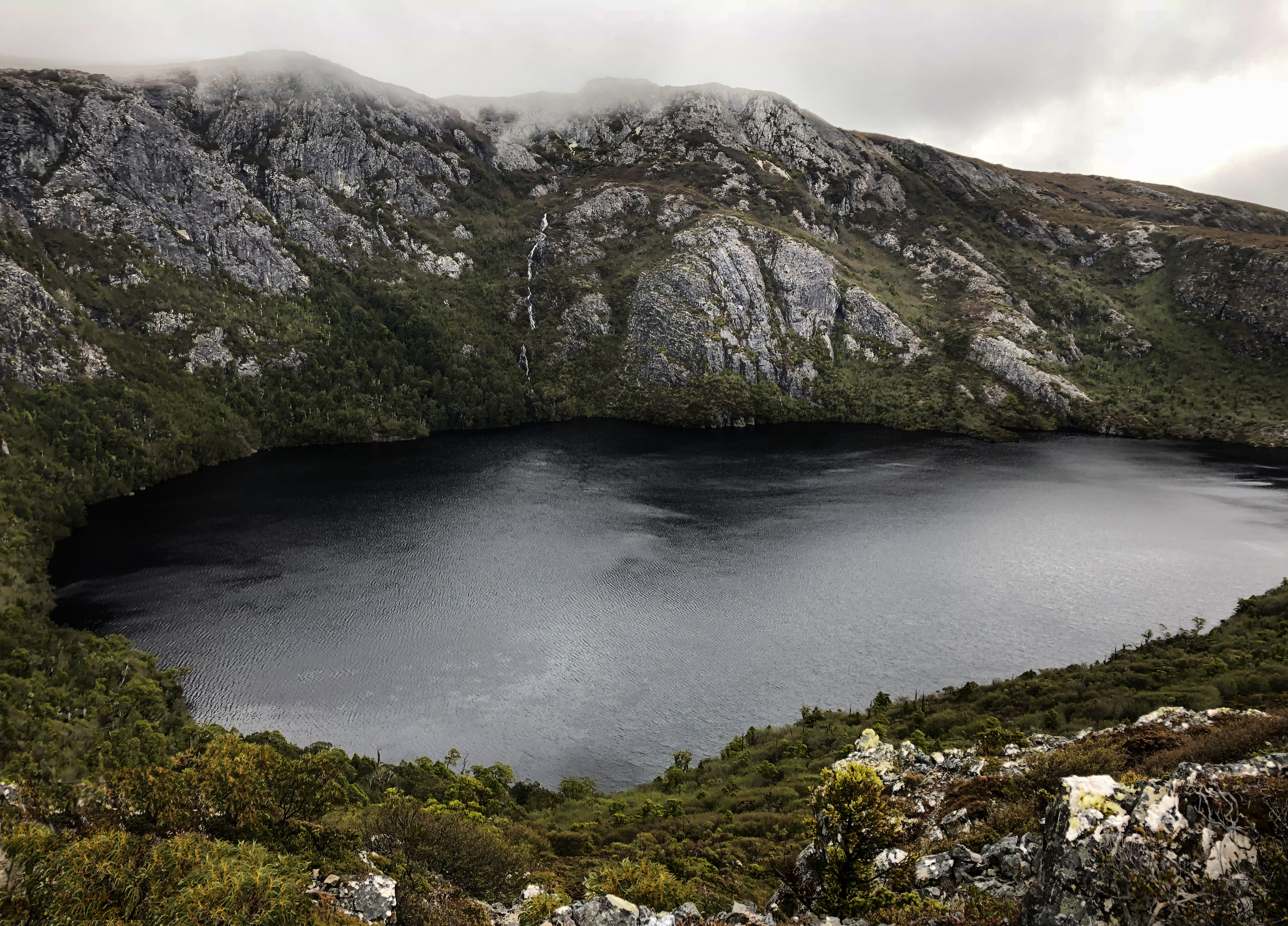 It`s afternoon – In the heart of the Tasmanian wilderness. I’m on a sixty-five km trail through the Cradle Mountain-Lake St Clair National Park. I take in the view: I am sitting in an elevated region – beneath me is a scene that demonstrates its beauty with modestly colours. The mountain lake, with its deep black colour it seems like all the surroundings get sucked into it. The only texture on the smooth water surface is the reflection of the surrounded summits, which lose their colour by mirroring in the lake and spawn even darker areas on the surface. The trees and bushes reach from the edge of the lake, even from inside the lake until the border where the mountains are not covered from vegetation anymore and disclose their real material. Huge rock faces disposed in an angle, which makes it look like one touch could make them go down into the lake. I feel like I do not belong here, my life in civilization has not equipped me for this journey.